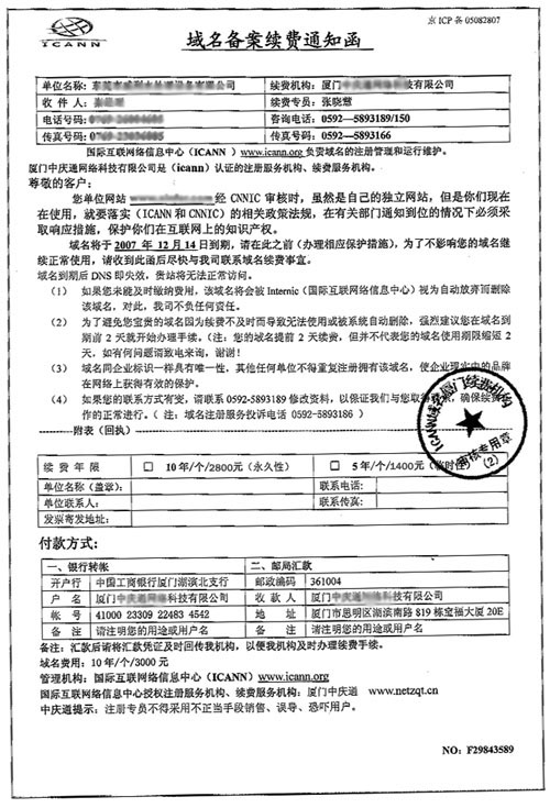 廈門地區(qū)出現的部分不法分子冒充工作人員,以發(fā)傳真或打電話的方式對客戶實施欺詐,企圖損害客戶的合法權益。如果通過了解客戶知道了域名為某某公司注冊的,而不是在他們廈門公司注冊的,這些不法分子通常謊稱“某某公司不做了,域名轉到他們公司了”或者說“你們這個某某公司是他們的分公司”等,隨后即要求將域名續(xù)費款交到其指定賬戶上。在此,信服科技鄭重提醒廣大用戶留意上述行為,避免上當受騙。